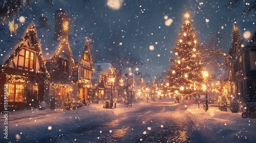 A festive snow-covered village with cobblestone streets lined by glowing cottages, a Christmas tree shimmering with ornaments and lights in the town square, snowflakes drifting softly,