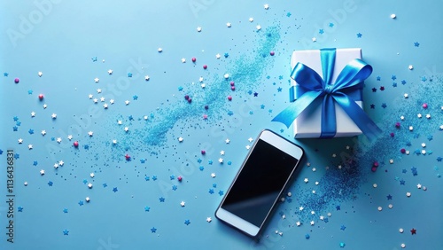 A Festive Surprise Gift Box with Blue Ribbon, Smartphone, and Sparkling Confetti on Blue Background