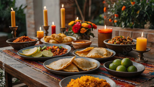 A festive table set with a variety of traditional dishes, candles, and vibrant flowers during a cultural celebration in an outdoor setting