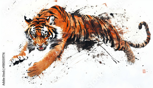 A fierce tiger stalking through a powerful, dynamic pose, on a stark white background