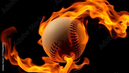 A fiery baseball isolated against darkness, showcasing vibrant flames in a striking close-up.