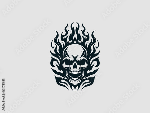 A fiery black and white skull with flames for hair and glowing eyes on a clean white background for halloween