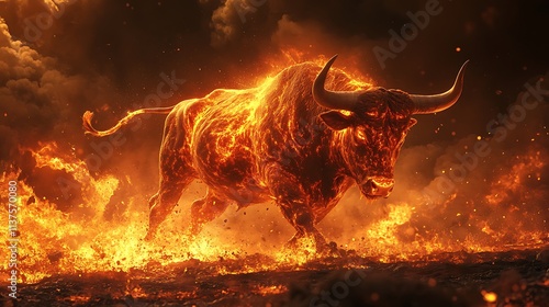 A fiery bull, its body radiating heat and glowing with molten patterns, charging through a volcanic wasteland, lava splashing under its hooves, ash clouds billowing in the distance, cinematic tones,