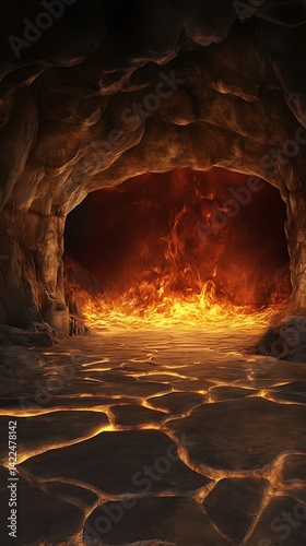 A fiery cavern with glowing lava and rocky walls, creating a dramatic, intense atmosphere.