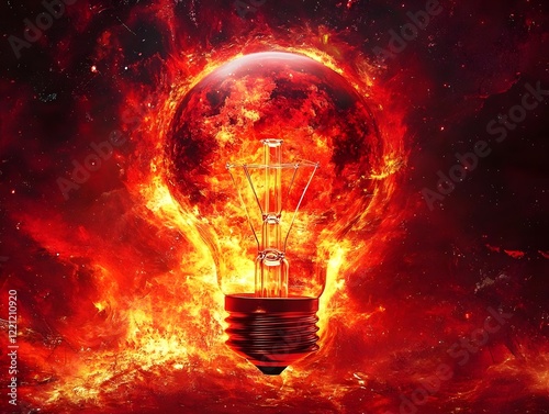 A fiery light bulb symbolizes innovation and energy, set against a cosmic backdrop.