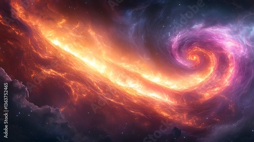 A fiery spiral of glowing orange light twisting through a deep purple cosmic sky.