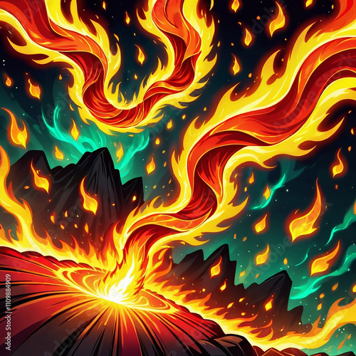 A fiery, stylized depiction of a volcanic eruption, with flames bursting from the mountain and swirling in the air against a dark background.