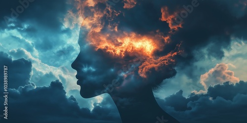 A fiery sunset aligns with a human profile silhouette amidst clouds. The artistic scene reflects introspection and emotion.