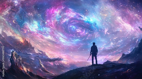 A figure stands against a cosmic backdrop of swirling galaxies and vibrant colors.