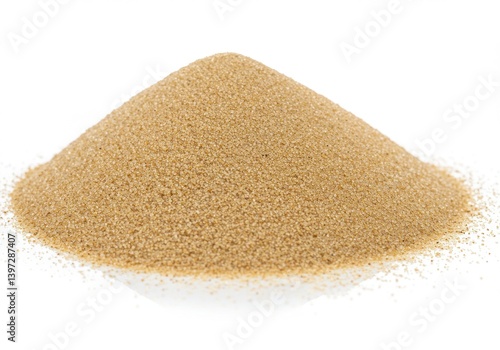 A finely textured pile of granular brown sand isolated on a white background with detailed clarity