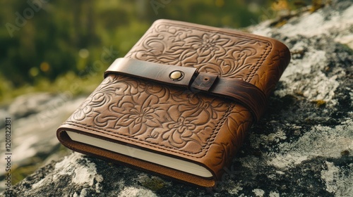 A finished, hand-stitched journal cover in soft leather with artistic patterns.