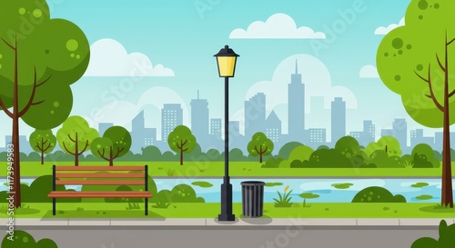 A flat illustration of a vibrant city park featuring a bench, a lamp post, a trash can and a pond with trees