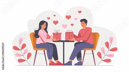 A flat vector illustration of two people sitting at a café table, exchanging gifts with heart-shaped decorations around them, celebrating Valentine’s Day