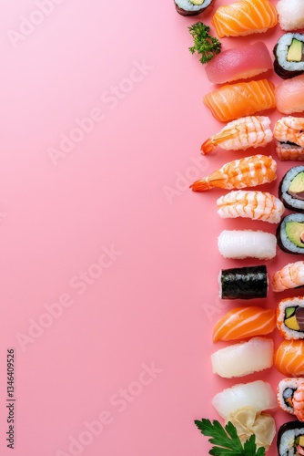 A flat-lay of sushi ingredients arranged in a gradient of colors.