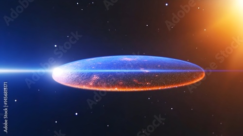 A flattened, fiery celestial body floats in space, emitting light, surrounded by a dark blue cosmos speckled with stars. A bright lens flare adds drama
