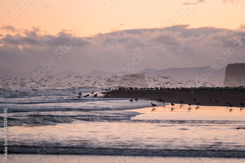 A flock of gulls soars over the water