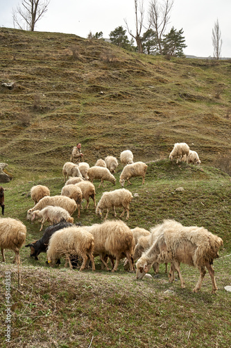 A flock of sheep grazes in a meadow in the mountains