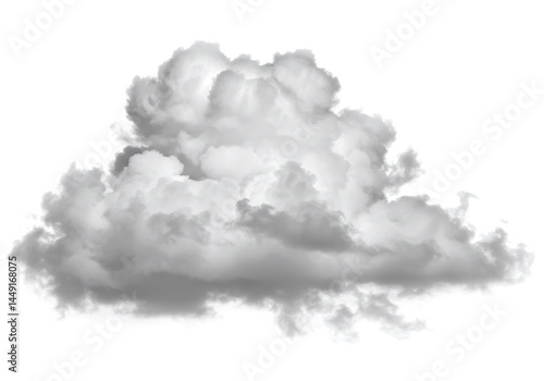 A fluffy cloud formation with shades of gray and white against a plain white background in the sky