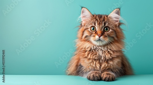 A fluffy Maine Coon cat lounges peacefully on a teal couch during a bright afternoon