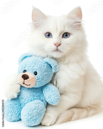 A Fluffy White Kitten Cuddles a Teddy Bear on White
