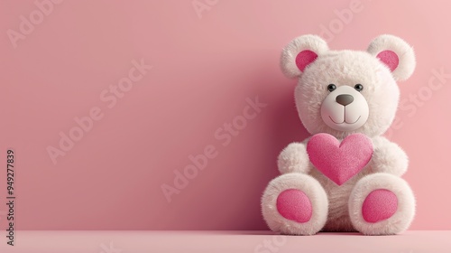 A fluffy white teddy bear holding a pink heart on a pink background.