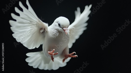 A flying white dove against a pure black background