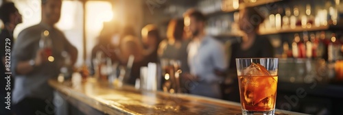 A focus on a whiskey cocktail on a bustling bar counter with blurred patrons and bartender in the background