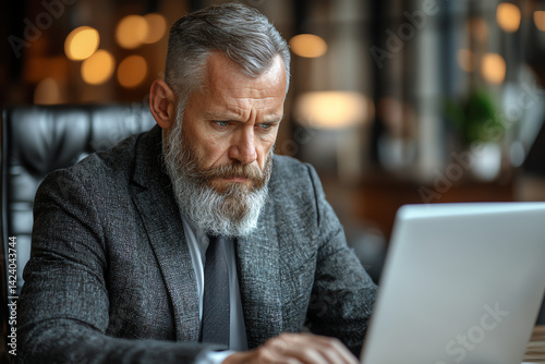 A focused businessman with gray beard working on a laptop in a modern office environment, showcasing concentration and professionalism.