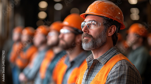 A focused construction worker in helmet and glasses, standing with colleagues, highlighting teamwork and safety in the workplace.