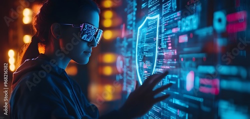 A focused individual interacts with a futuristic interface, showcasing technology and digital innovation in a cyber environment.