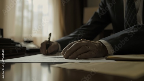 A focused scene capturing the poised hand of a business professional signing important documents, evoking themes of decision-making and authority.