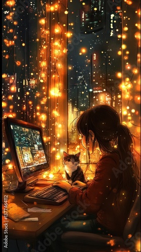 A focused woman sits at a modern desk, typing on her sleek laptop. Sunlight streams through a nearby window, illuminating her workspace filled with notebooks and a coffee cup.
