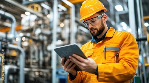 A focused worker in an orange safety suit uses a tablet in a modern industrial environment, showcasing the blend of technology and manual labor in today's factories.