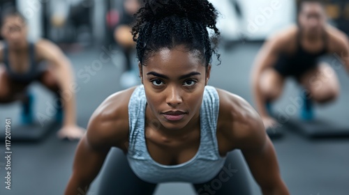 A focused young woman with dark curly hair performs a fitness exercise in a gym, with two other women blurred in the background, also working out.