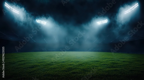 A foggy soccer stadium illuminated by bright floodlights, showcasing a lush green pitch.