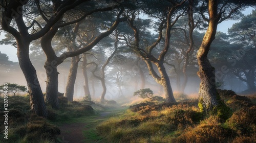 A foggy woodland in early morning, with mist drifting through the trees and soft light illuminating the foliage.