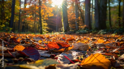 A forest floor covered in autumn leaves