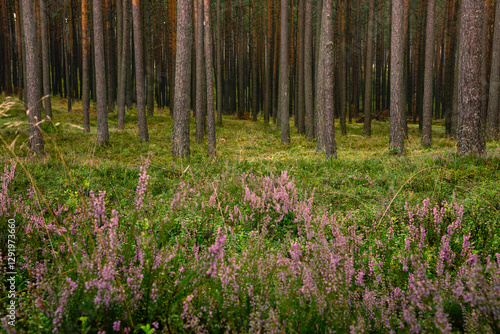 A forest with a field of purple flowers. The flowers are scattered throughout the field and the trees are tall and green