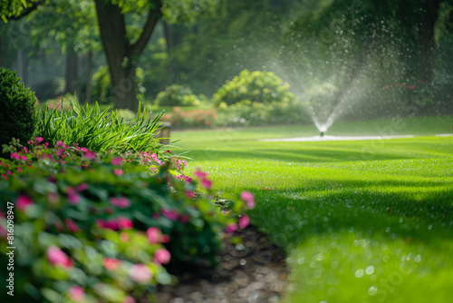 A fountain waters a flowerfilled natural landscape in the park. Generative AI