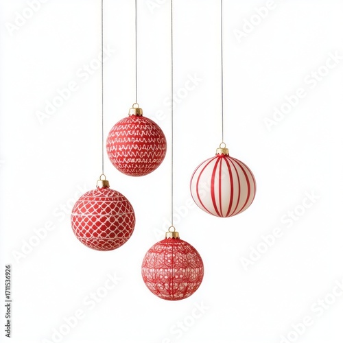 A four cute christmas pattern red baubles hanging down ornaments white accessories.