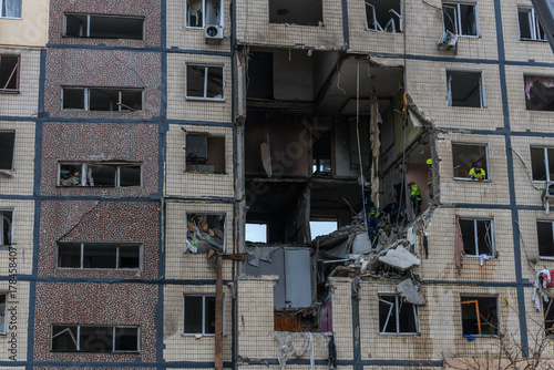 A fragment of the facade of an apartment building, showing extensive damage as a result of an explosion or shelling. The breach in the wall spans several floors and reveals the destroyed interior.
