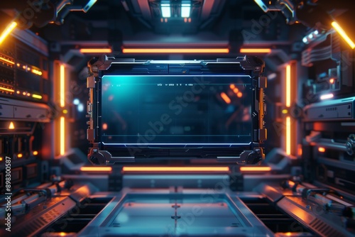 A frame of sleek metal and glowing LED lights, with a high-tech interface. The center is a blank, holographic screen.