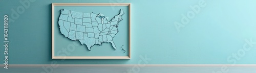 A framed map of the United States decoratively displayed on a light blue wall, blending modern aesthetics with geographical art.