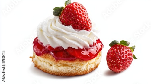 A fresh strawberry shortcake with whipped cream on a white isolated background