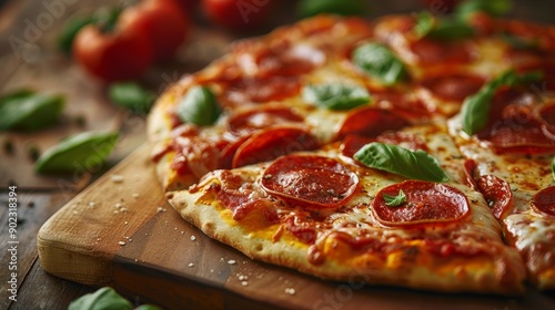 A freshly baked pepperoni pizza with melted cheese and basil leaves on a wooden board.