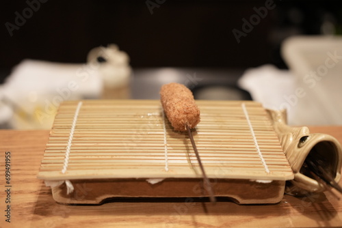 A fried skewer on plate in a restaurant in Tokyo, Japan.