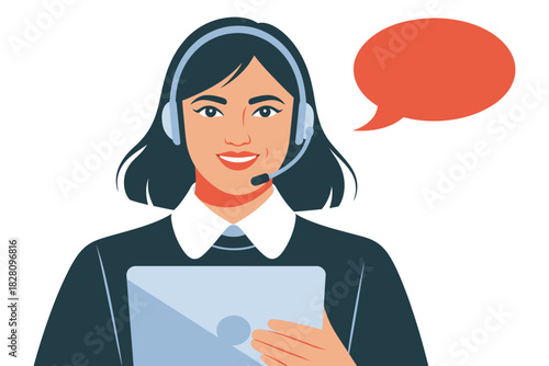 A friendly customer service representative wearing a headset speaks with a speech bubble.
