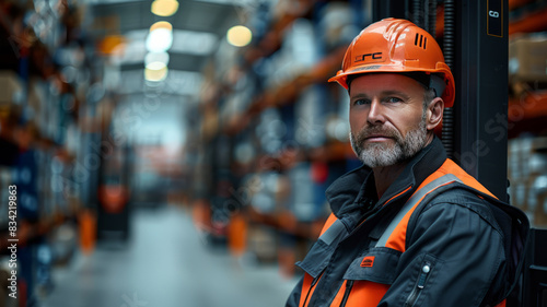 A friendly forklift operator in a well-lit, busy warehouse, emphasizing safety and efficiency.generative ai