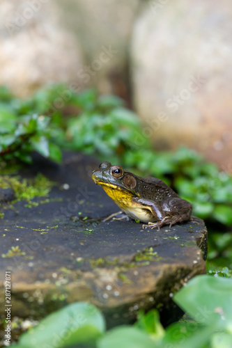 A Frog sitting on a rock in a garden pond surrounded by green leaves