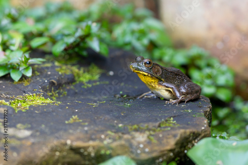 A Frog sitting on a rock in a garden pond surrounded by green leaves